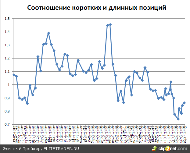 Обратив внимание на открытые юридическими лицами позиции по фьючерсу на индекс, можно заметить, что настроения крупных игроков за прошедшую неделю немного изменились в сторону возможного снижения, но в целом продолжают смотреть вверх. Соотношение коротких и длинных позиций сейчас составляет 0,86, против 0,84 двумя днями ранее.