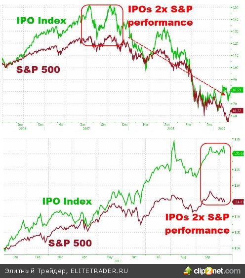 Именно так было в 2007 и 2011 годах, после чего рынок резко падал. Интересно, что в сентябре 2013 года произошел именно такой случай – рост индекса IPO вдвое превзошел динамику индекса S&P 500, так что возникает закономерный вопрос – не может ли опять негативный сценарий. Zerohedge.com