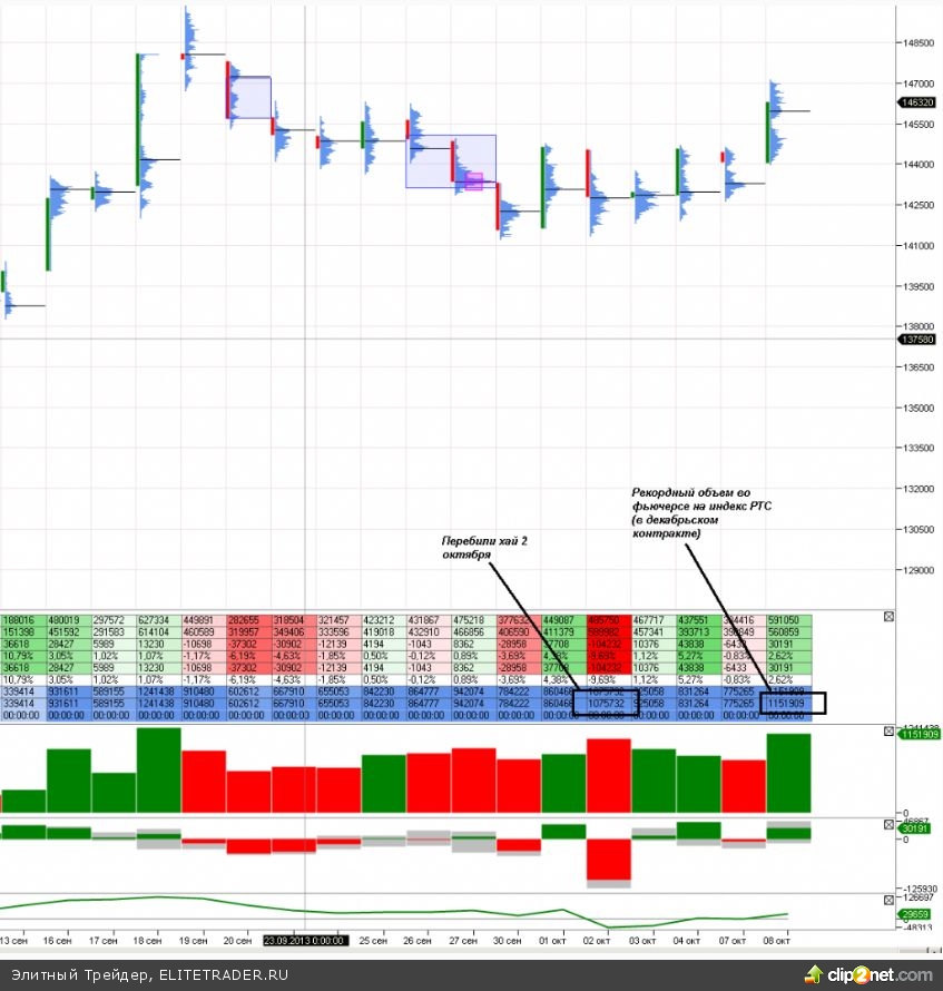 (Шарипов Г. «Медведь и бык») Именно в этой зоне была агрессивная дельта селлера после заседания ФРС в сентябре (20 сентября). Именно после прохода этой зоны зависит будущее тренда во фьючерсе на индекс РТС. В этой зоне все лонги были закрыты. Работать на пробой такой зоны сейчас непозволительная роскошь. В то же время шорт также считаю рискованным, более интересным сейчас смотрится лонг фьючерса доллар-рубль.