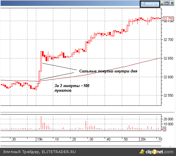 Она смотрелась как шортовая. Близость сопротивления 32,3 + набор объема на уровне. Укрепление рубля и началось. Однако оно было настолько мизерным и не импульсным, что в итоге оказалось ложным движением. А истинное движение — на вечерке (импульсом). Шикарнейшим импульсом. За 2 минуты +10 копеек.