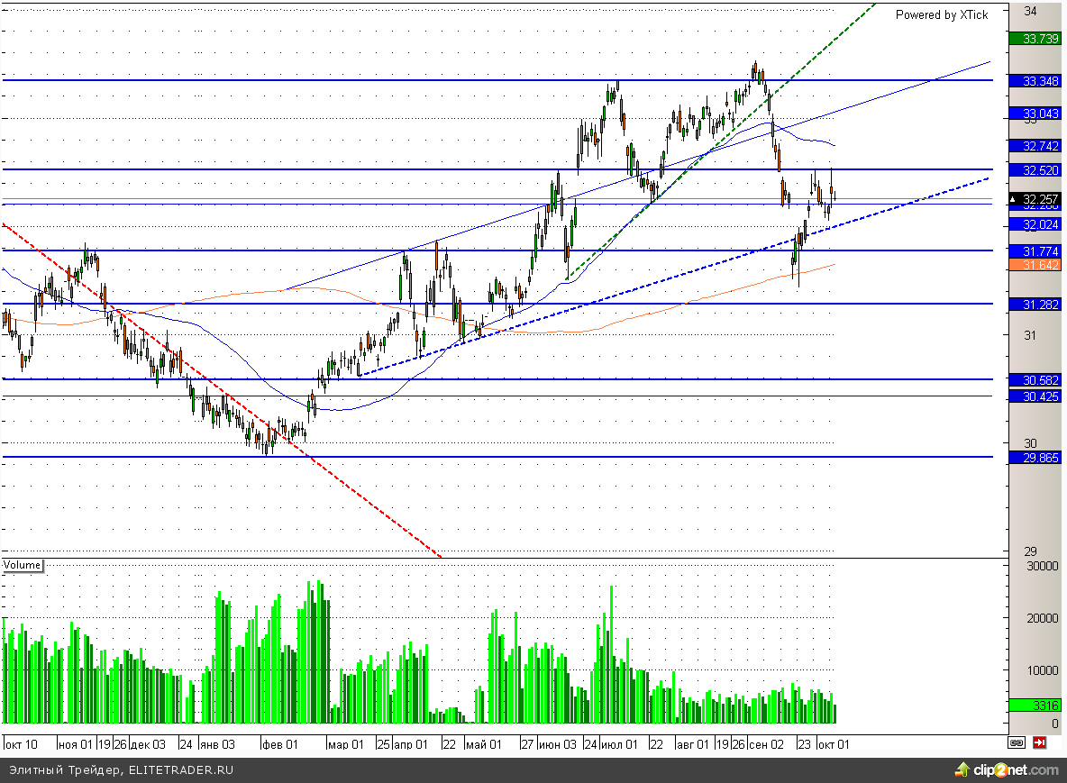 Между тем пара доллар/рубль торгуется около трендовой линии на уровне 32,1. Пробой данной отметки сейчас крайне маловероятен. Поэтому в ближайшее время мы, скорее всего, увидим укрепление американской валюты.