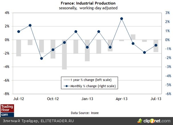 На сегодняшний день экономические показатели, демонстрируемые второй по величине экономикой в Европе, пока рисуют смешанную картину в лучшем случае. Тем не менее, национальная статистическая служба Insee на прошлой неделе пересмотрела свой прогноз, заявив, что показатель экономической активности в стране в 2013 году впервые восстановится до уровней, которые наблюдались до Великой рецессии. «Во Франции деловой климат, который начал улучшаться в промышленном секторе этой весной, сейчас восстанавливается во всех секторах», — с оптимизмом заявляет Insee. — «Поэтому в 3-м квартале ВВП должен стабилизироваться, а в 4-м квартале продолжит расти». Естественно, всех интересует ответ на вопрос о том, откликнется ли на улучшение настроений реальная статистика. Пока что ответа нет. Может быть, отчет о промышленном производстве прольет свет? Экономисты надеются на обнадеживающие результаты. Консенсус-прогноз предусматривает, что в августе рост промышленного производства составил 0,5%. Если прогноз сбудется, то это будет лучший показатель месячных изменений с апреля. Кроме того, в этом случае оптимисты смогут с большей уверенностью утверждать, что экономика Еврозоны действительно возрождается из пепла.