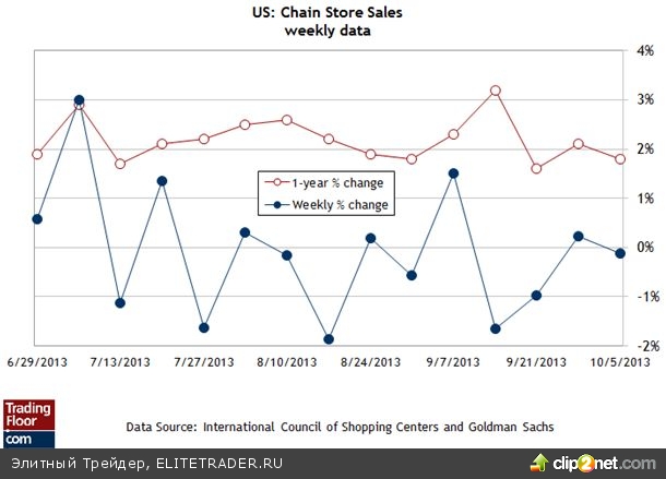 Продажи в сетевых магазинах в США (~17:00 GMT): После того как проанализируете потребительские настроения (отчет о которых выйдет чуть раньше в форме индекса потребительского комфорта Блумберг), следует обратить внимание на реальную статистику по потребительским расходам на основании индикатора продаж в крупнейших розничных центрах страны. Хотя точное время выхода ежемесячного отчета Международного совета торговых центров (International Council of Shopping Centers — ICSC) неизвестно, интерес к нему будет высокий в связи с отсутствием правительственных данных. Между тем еженедельные данные по продажам в сетевых магазинах, которые публикуются отдельно, указывают на то, что сегодня мы увидим неизменный показатель или ухудшение значения.