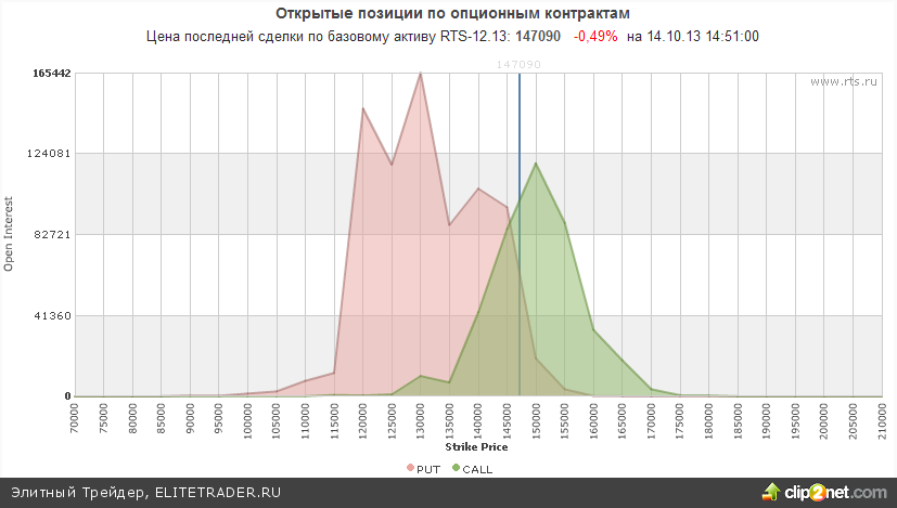 Между тем открытые опционные позиции по RIZ3 со сроком исполнения 15.10.13 сейчас выглядят нейтрально. На отметке 145000 можно увидеть большое количество опционов пут, которые выступают как очень сильная поддержка. При этом максимальное количество опционов колл расположилось лишь вблизи уровня 150000, что при текущей цене равной 147000 не дает ровным счетом никаких сигналов.