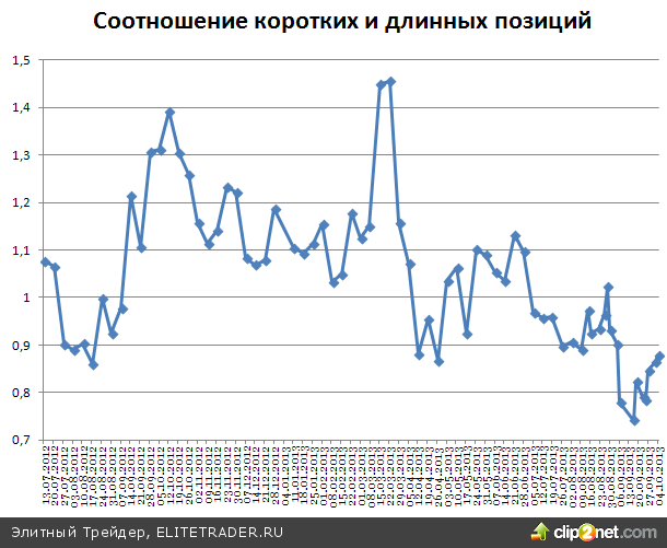 Обратив внимание на открытые юридическими лицами позиции по фьючерсу на индекс, можно заметить, что настроения крупных игроков хоть и продолжают смотреть в сторону покупок, но уже постепенно смещаются в более нейтральное положение. Соотношение коротких и длинных позиций по состоянию на 11 октября составляет 0,879 против 0,864 несколькими днями ранее.