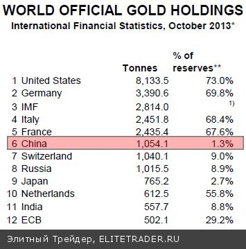 По официальным данным, Китай находится на 6-м месте в мире по запасам золота, при этом этот рейтинг не изменялся с 2009 года. По собственным расчетам Zerohedge, реальные золотые запасы КНР должны быть на 2500 тонн больше, что ставит ее на второе место – между США и Германией. Кроме того, ежемесячно резервы золота Китая увеличиваются на 100 тонн. Zerohedge.com