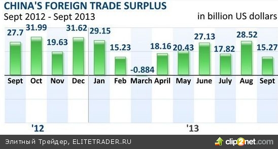 Сокращение экспорта может стать ударом для Китая. Экспорт КНР в сентябре неожиданно упал на 0.3% по сравнению с аналогичным месяцем прошлого года. Это стало неожиданным падением после роста на 7.2% в августе и по сравнению с прогнозом аналитиков роста на уровне 5.5%. Экспорт в Гонконг упал на 4.1%, в Тайвань – на 8.6%, а поставки в ЕС уменьшились на 1.1%. Положительная динамка экспорта была в США (+4.2%) и Японии (+1.3%).