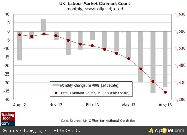 Заявки на пособие по безработице в Великобритании (08:30 GMT) Наблюдаемое в настоящий момент падение количества безработных, живущих на пособие, является и, скорее всего, останется главным статистическим фактором, свидетельствующим о том, что экономика Великобритании восстанавливается обнадеживающими темпами. Ожидается, что сегодняшний отчет внесет свою лепту в эту благоприятную тенденцию. Экономисты полагают, что в сентябре количество заявок на пособие по безработице упало на 28 000, согласно среднему прогнозу. Если ожидания сбудутся, то это будет уже десятый месяц падения.