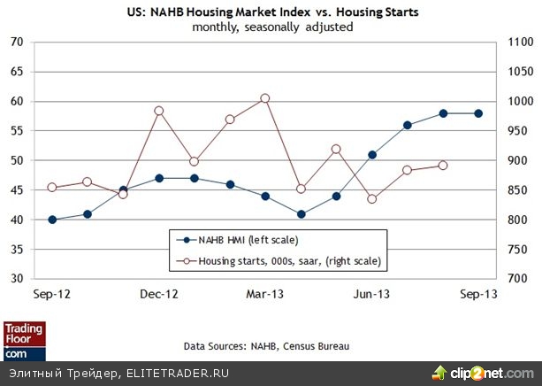 Индекс жилищного рынка NAHB в США (14:00 GMT) Никто не может с уверенностью сказать, чего будет стоить макроэкономике частичное закрытие правительства США и близкая опасность дефолта по ГКО. Но это не мешает экономистам делать взвешенные прогнозы. «Прямое влияние двухнедельного периода остановки в работе правительства с 1 октября на рост реального ВВП в четвертом квартале составит 0,3 процентных пункта», — утверждает Macroeconomic Advisers. Последствия не очень существенные, но многое зависит от того, как будет себя вести жилищный рынок в оставшийся период года. Сегодняшний ежемесячный отчет о настроениях от Национальной ассоциации застройщиков (NAHB) поможет понять, чего нам следует ожидать.
