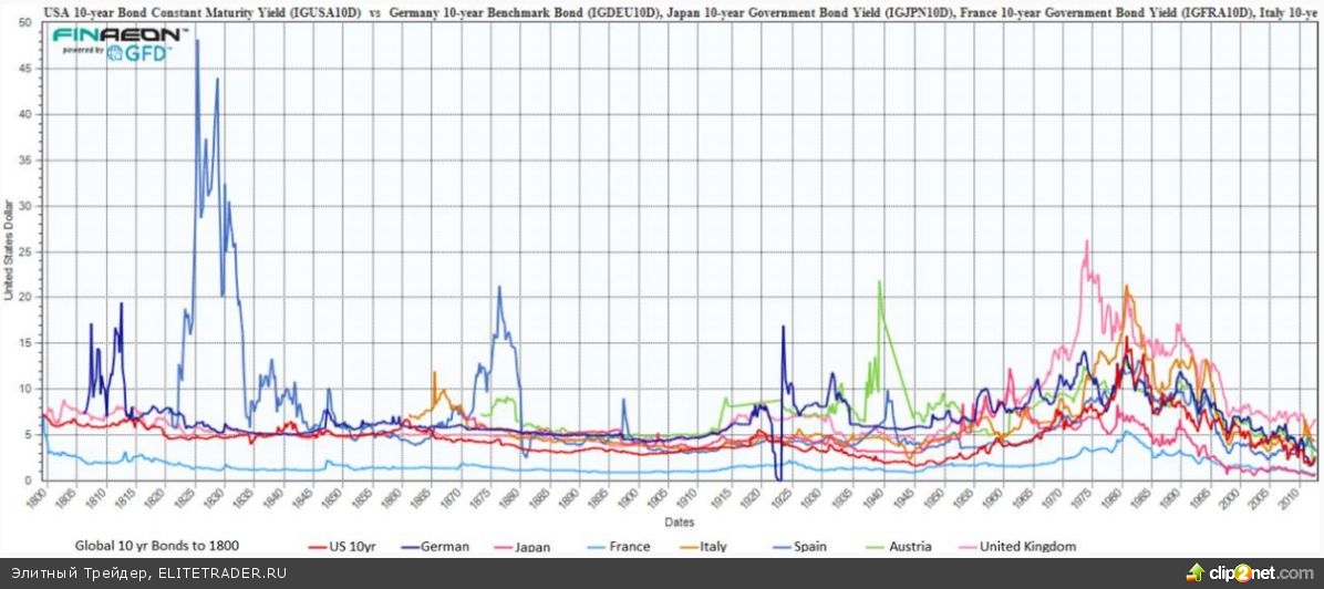 График динамики 10-летних гособлигаций развитых стран с 1800 года