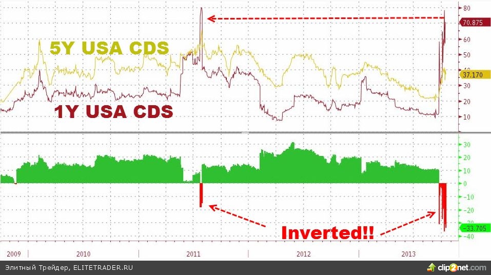 Между тем, американский рынок дефолтных свопов (CDS) демонстрирует высокие риски технического дефолта - этот показатель уже превысил значение 2011 года, когда американские политики в последнюю минуту приняли решение поднять потолок госдолга. Цена страховки американских бондов со сроком 1 год за последние три недели показывает очень сильный рост, намекающий на то, что этот случай более рискованный, чем два года назад. Zerohedge.com