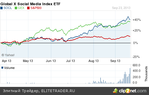 Global X Social Media Index ETF (тикер SOCL) – этот фонд получил довольно много внимания общественности, когда стало известно, что он готов стать первым ETF, включившим в свою структуру акции Twitter сразу же после проведения IPO. Во время выхода этой новости неделю назад под управлением в SOCL находилось $23 млн, сейчас активы выросли до $30 млн – прирост на 26% всего за несколько дней. Но пока можно не учитывать Twitter, поскольку публичного размещения акций еще не произошло. Фонд SOCL имеет самую большую долю Facebook среди всех ETF. То же касается LinkedIn и Tencent. Эти бумаги суммарно составляют 34% активов фонда, что объясняет рост котировок SOCL на 47% в этом году.