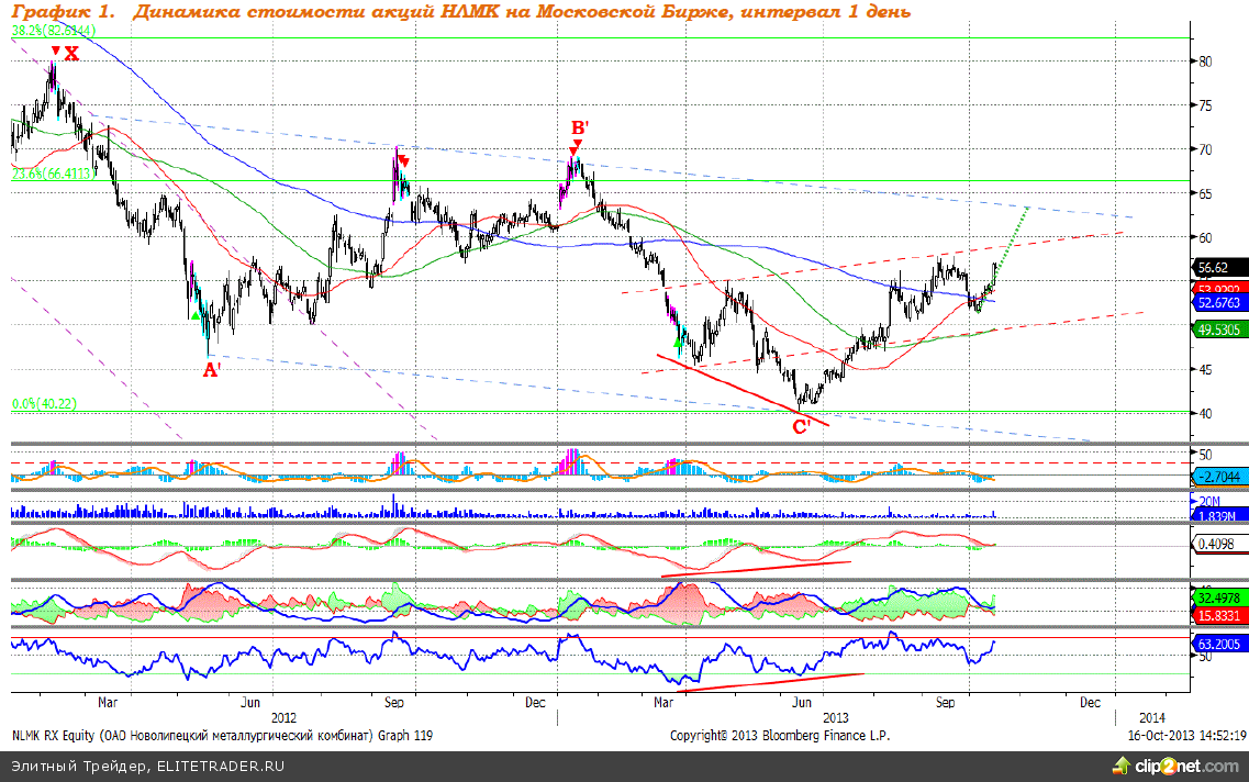 Котировки акций НЛМК завершили формирование структуры масштабной нисходящей коррекции, которая развивалась в течение последних 2,5 лет, при этом в последний год наблюдалось явное замедление нисходящего тренда. Оканчивая развитие последней фазы снижения (волны C’) график цены акций компании, а также индикаторы MACD и RSI сформировали дивергенцию, что подтверждает правильность оценки структуры снижения и говорит о возможности смены тренда. В настоящее время формируется фигура, которая в случае продолжения роста и преодоления уровня 59,00 рублей за акцию может стать моделью «перевернутые голова и плечи», что может послужить ещѐ одним хорошим сигналом смены нисходящего направления движения цен на акции НЛМК на восходящее. Сейчас наиболее вероятной целью роста можно назвать уровень 63,00 рубля за акцию. В то же время, мы не исключаем выхода из нисходящего канала, который обозначен на графике 1 светло-синим пунктиром, и начала формирования восходящего тренда с более масштабными ориентирами роста. Индикаторы: MACD на дневном графике формирует сигнал вверх. Индикатор повышения DMI+ находится выше индикатора снижения DMI- (индикаторы расходятся), индикатор силы тренда ADX расположен в средней части шкалы и развернулся вверх, что указывает на возобновление развития среднесрочного восходящего тренда. Индикатор, основанный на динамике ADX, выглядит нейтрально. Осциллятор RSI приближается к зоне перекупленности, однако сигналов пока нет. Рекомендуем: покупку акций НЛМК по текущей цене (56,50 рубля за акцию) с целью продать на уровне 63,00 рубля (+11,50%), стоп-приказ на отметке 55,49 рубля (-1,79%), временная перспектива — 3 месяца. Поддержка: 57,10; 57,90; 58,90; 60,70; 62,00; 63,00. Сопротивление: 55,50; 53,50; 52,65; 51,35; 49,65