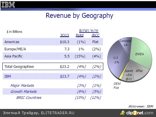 Между тем, акции отчитавшихся вчера после закрытия IBM и eBay, довольно сильно просели на постмаркете, что окажет негативное влияние на рынок в четверг, в особенности на показатели индекса Dow Jones где бумаги IBM имеют наибольший вес. Акции eBay на постмаркете вчера обвалились на 5,3% - компании ожидает в праздничном квартале прибыли на уровне 79-81 цента на акцию, против прогноза Wall Street на уровне 83 центов. IBM разочаровала акционеров снижением продаж шестой квартал подряд, что отразилось на котировках вчера 6%-ым провалом. Выручка упала на 4% до $23,7 млрд. в третьем квартале.