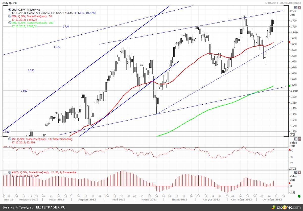 Индекс S&P500 еще во второй половине предыдущей недели, нащупав локальное дно, по мере прояснения ситуации и приближения обозначенной министром финансов Джеком Лью даты 17 октября, набирал обороты, и непосредственно на новостях об урегулировании ситуации выстрелил к новым историческим максимумам. Здесь нужно отметить, что помимо негативных последствий shutdown, которые агентство S&P оценило в потере 0,6% роста ВВП, для спекулянтов видятся и позитивные перспективы в части сохранения текущей стимулирующей политики американским Федрезервом по крайней мере по итогам октябрьского заседания.