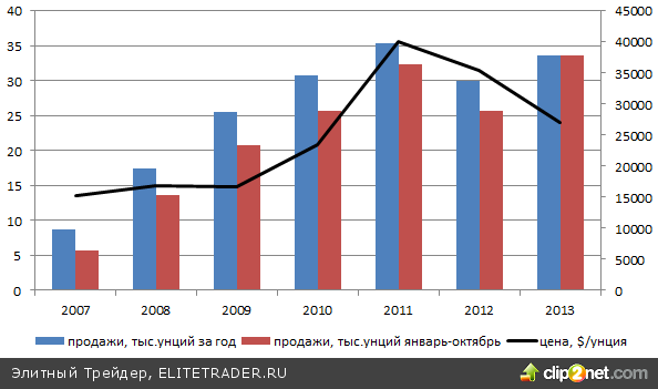 Главным позитивом для серебра является рост объемов продаж Американского монетного двора. Показатель в январе-октябре достиг исторического максимума за этот период и вполне способен побить рекорд, зафиксированный по итогам 2011 года.