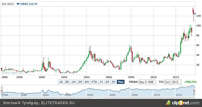 Акции американской биофармацевтической компании Onyx Pharmaceuticals за последнее десятилетие продемонстрировали поистине астрономические темпы роста, и наиболее прозорливые инвесторы успели нажить на этом целое состояние. В октябре 2002 г. акция Onyx не стоила и $4, а в сентябре 2013 г. она уже превышала $124. Бумага подорожала в 31 раз за 11 лет и оказалась одним из самых прибыльных вложений среди американских компаний фармацевтического сектора.