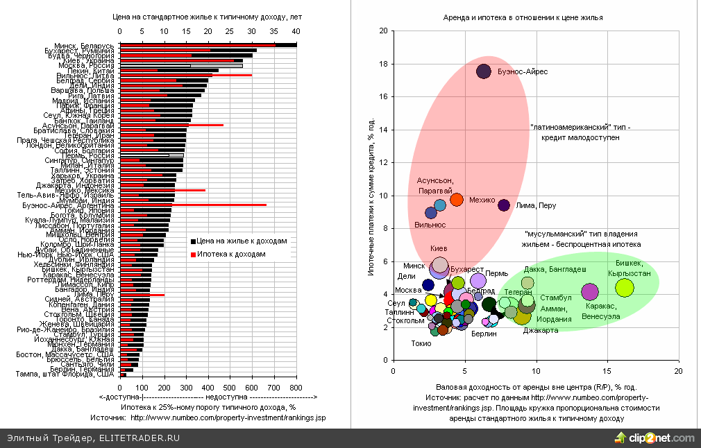 Иными словами, чтобы более-менее нормально жить в этих столицах, требуется доход, как минимум в 3-4 раза превышающий типичный для соответствующих стран (если, конечно, вы изначально не являетесь собственником жилья здесь). Обычно такое же, или чуть большее соотношение с типичными доходами требуется и для покупки жилья в кредит (плюс 20% цены - это условие расчетов для первоначального взноса). Исключая мусульманские страны, где, как известно, процента нет, и сама по себе «ипотека» практически бесплатная, зато аренда - дорогая.