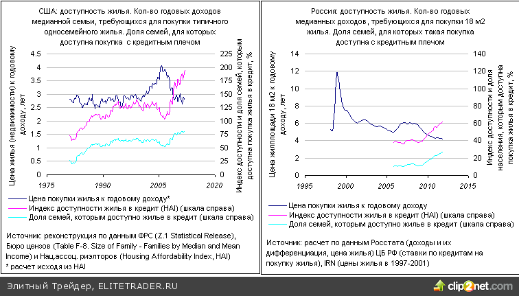 На самом деле, и 60%-ная доступность - это не так уж много, например, на фоне США. Там даже снижение доступности ипотеки до уровня в 52% (по моим подсчетам) семей в 2006 вызвало кризис «субстандартных ссуд». А в настоящее время покупку жилья с кредитным плечом могут себе позволить 80% семей. И это несмотря на то, что реальные душевые денежные доходы медианной американской семьи оставались примерно на одном уровне все 00-е, а сейчас и вовсе снизились до уровня 1998, а дифференциация семей по доходам выросла.