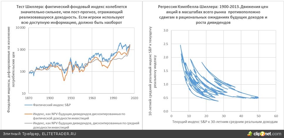 Однако и в более реалистичных предположениях, когда игроки рынка не знают этих значений, но рационально обрабатывают всю имеющуюся информацию, дисперсия «фундаментальных» цен, соответствовавших реализовавшейся дисконтированной стоимости будущих дивидендов, должна быть равна сумме дисперсии фактических цен и дисперсии ошибки прогноза (вытекает из того, что при рациональном использовании всей имеющейся информацию ошибки прогноза должны быть коррелированы с любой информацией, доступной сегодня, в частности, по текущей цене). Другими сломами, дисперсия цены актива (фондового индекса) должна быть меньше, чем дисперсия «фундаментальной» цены экс-пост. Тем самым Шиллер привел весьма изящное доказательство, что движения цен на фондовом рынке иррациональны и не поддаются пониманию и прогнозированию.