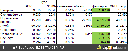 ADR в США 18.10 (Северсталь, Роснефть, ВТБ в Лондоне ) и закрытие вечерних фьючерсов в России Цветами (или знаками +-) далее изображен характер разницы по сравнению с закрытием вечерних фьючерсов ночью накануне. Евро/доллар ))1.3676 в 7.38 понедельника))1.3666 в 7.41 пятницы ))1.3548 в 7.46 четверга)