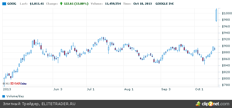 К новым высотам S&P500 тащил высокотехнологичный сектор во главе с акциями отчитавшейся после закрытия в четверг Google. Но если на постмаркете рост здесь составлял порядка 8%, то в ходе основных торгов цена подскочила почти на 14%. При этом впервые была пройдена отметка в $1000 за акцию. Если бы бумага включалась в состав Dow Jones 30, она бы оставила на задворках текущих тяжеловесов IBM и Visa в плане влияния на динамику индекса.