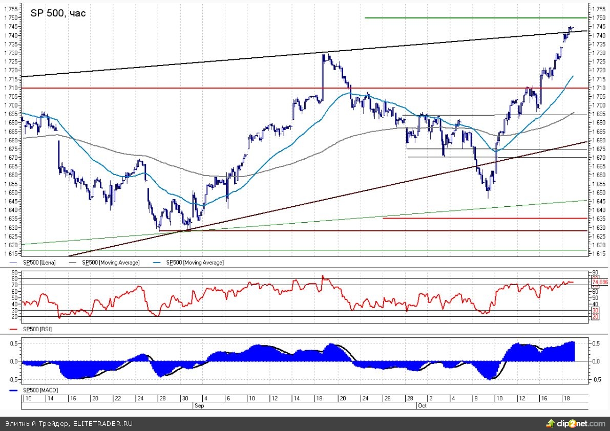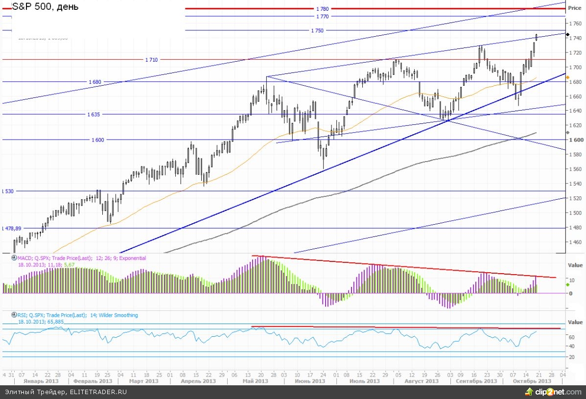 Американский рынок согласно динамике индекса S&P500 в прошедшую пятницу продолжил восходящее движение, установив очередной абсолютный рекорд, закрывшись на отметке 1744,5 пункта, прибавив при этом 0,65%. С технической точки зрения, индекс вышел вверх из восходящего клина, что является позитивным сигналом, на фоне ожидавшегося ранее масштабного разворота, и в случае пробоя 1750 сделает заявку на пока еще далекие 1800 пунктов.