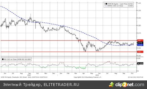 Тестирует ли дно акции энергетической фишки России Русгидро? этот вопрос сейчас интересует многих. Согласно технической картине, акции еще не перешли в стадию трендового роста. Движение проходит лишь в среднесрочном диапазоне 0,45 – 0,60 руб. за акцию. Как скажут оптимисты, падение прекратилось, и то хорошо. На наш взгляд актив реально дешев, но для покупки время не пришло. Лишь преодолев и закрепившись выше уровня 0,60, актив может быть интересен.