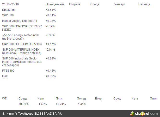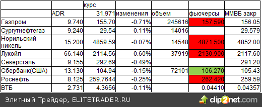 ADR в США 21.10 (Северсталь, Роснефть, ВТБ в Лондоне ) и закрытие вечерних фьючерсов в России Цветами (или знаками +-) далее изображен характер разницы по сравнению с закрытием вечерних фьючерсов ночью накануне. Евро/доллар ))1.3667 в 7.44 вторника))1.3676 в 7.38 понедельника))1.3666 в 7.41 пятницы ))