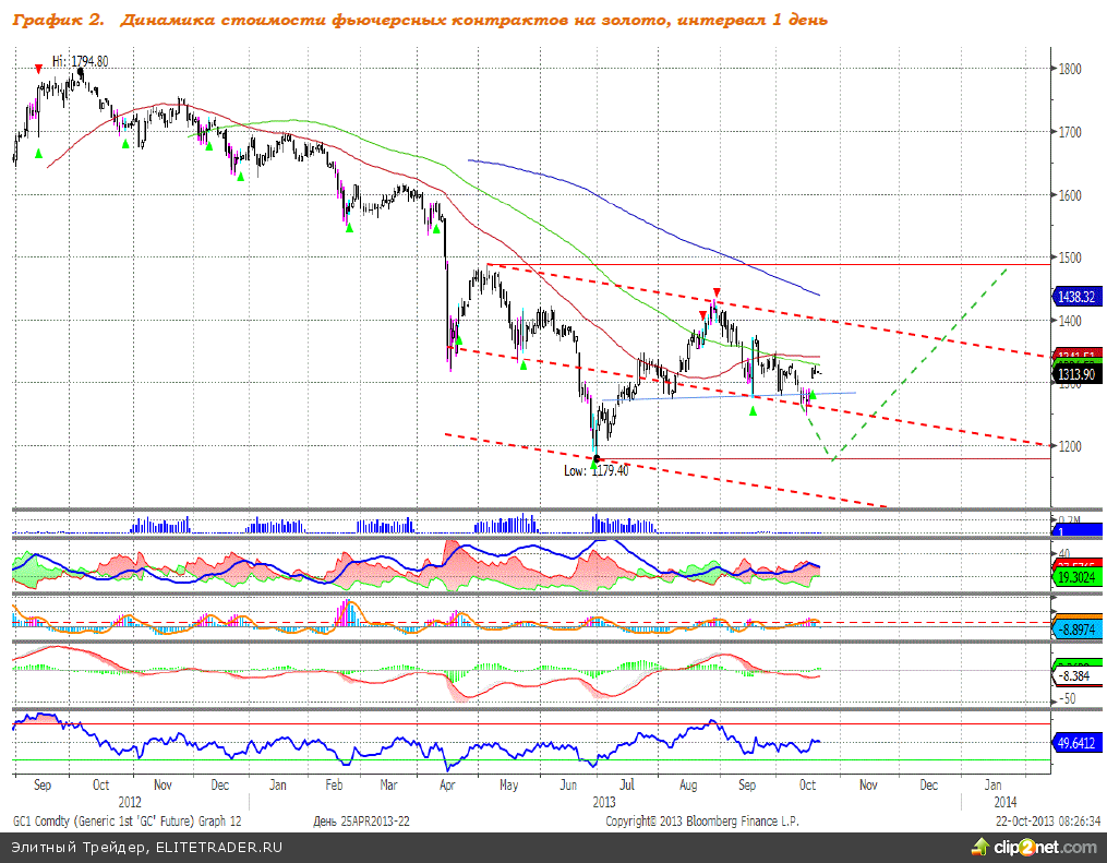 Котировки золота в последние дни не показали выраженной динамики, однако разворотную модель «голова и плечи» можно считать сформированной, что указывает на возможность снижения котировок фьючерсного контракта на золото к уровню $1175-1180 за тройскую унцию. В целом же, котировки драгоценного металла явно замедлили скорость снижения, что говорит о высокой вероятности возобновления роста. На графике 2 мы отобразили зеленой пунктирной линией предполагаемую динамику стоимости контракта на золото. Полагаем, в ближайшие месяцы, после снижения к минимальному значению, которое было показано в конце июня 2013 года, цены на золото пойдут вверх, сформировав более масштабную модель «двойное дно» (см график 1), что станет сигналом к будущему долгосрочному восходящему тренду.