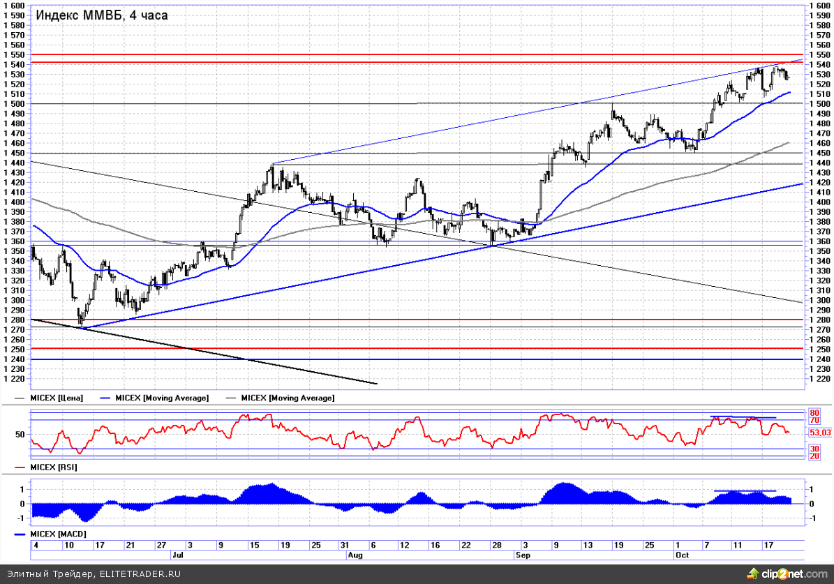 Что касается конкретно индекса ММВБ, то здесь все в целом остается без изменений. Рынок все также консолидируется под важной горизонтальной зоной сопротивления 1540-1550п. Здесь же проходит и верхняя граница восходящего канала, так что помех для роста предостаточно. Тем не менее, шансы на тестирование 1550 пока еще сохраняются. В качестве же самой ближайшей зоны поддержки выделим отметку 1500п.