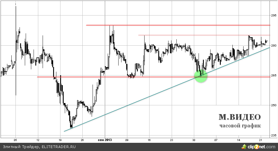 Бумаги М.Видео к середине дня растут на 0.7%, несмотря на общий умеренный пессимизм всего российского рынка. Пока мировое инвестсообщество готовится к публикации ключевой американской статистики, покупатели акций М.Видео тестируют локальное сопротивление 285 рублей, после которого «рукой подать» до ключевого уровня 300 рублей.