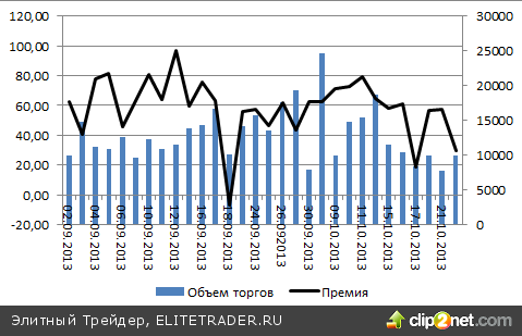 Динамика премий ($ за унцию) и объемов торгов (кг) золотом в Шанхае