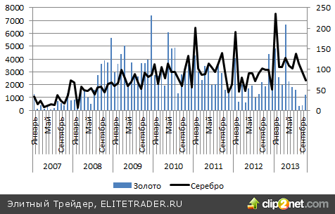 В октябре продажи золота превысили объемы реализации за два предыдущих месяца, а суммарный показатель по серебру в январе-октябре достиг очередного исторического максимума за исследуемый период.