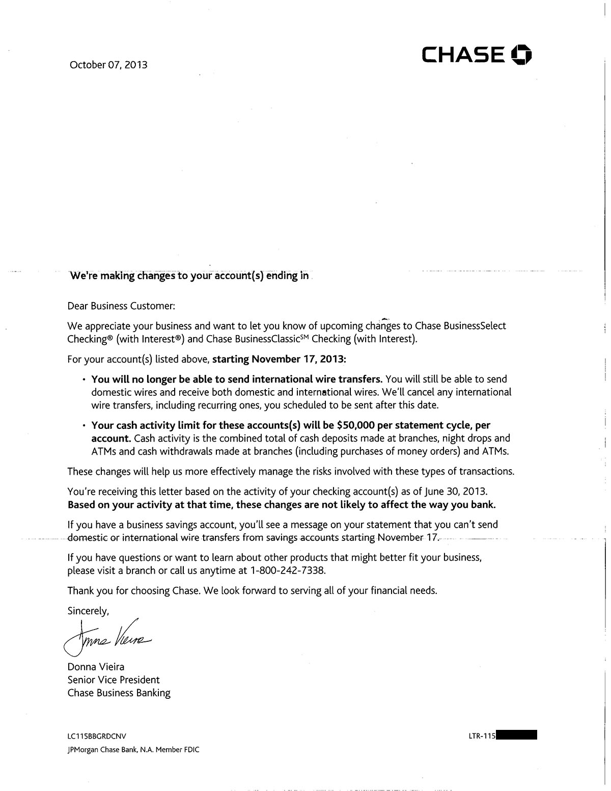 Вчера наш читатель прислал нам письмо, полученное им от департамента кредитования бизнеса банка JPMorgan Chase, в котором есть нечто очень тревожное. По какой-то причине JPM решил, что после 17 ноября 2013 года он прекратит международные денежные переводы, уточняя, что он «отменит любые международные переводы, включая повторяющиеся», но, что более важно, ограничивает действия с наличными на счетах юридических лиц до $50,000 за отчетный период. «Действия с наличными – это сумма вкладов наличными, сделанных в отделениях, ночные вклады и снятие со счетов в банкоматах и отделениях».