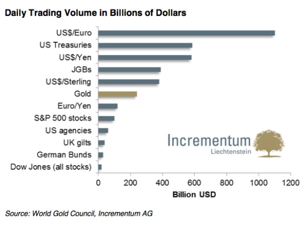 Рынок бумажного золота рос геометрически в последние годы, дневные объемы торгов достигли $240 млрд в день (золотым на графике), что больше суммарного объема торгов эталонных фондовых индексов S&P 500 и Dow Jones.