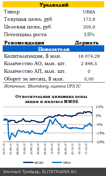 В условиях высокой неопределенности на мировом рынке удобрений, слабого спроса на калий, Уралкалий, хоть и оставаясь лидером в отрасли, уже не показывает высокие темпы роста операционных и финансовых показателей, к которым все привыкли. Теперь инвесторы также находятся в условиях неопределенности, ожидая, во-первых, экстрадиции гендиректора Уралкалия В. Баумгертнера, а во-вторых, восстановления на рынке калия. По итогам 2013 года мы ожидаем снижения чистой прибыли производителя на 11% до $1,417 млрд (в 2012 году показатель составил $1,597 млрд). По итогам первого полугодия чистая прибыль составила лишь $397 млн., что было связано со списаниями по курсовым разницам. Дивидендные выплаты, таким образом, не превысят $200 млн, что почти вдвое меньше уровня 1П12 года (дивидендная доходность составит около 1,3%). И, тем не менее, в условиях, когда рассчитывать на рост цены акций пока сложно, можно поучаствовать в распределении прибыли компании, которая традиционно платит неплохие дивиденды. Ожидаем увеличения спроса на бумаги компании вплоть до 29 октября, когда состоится закрытие реестра акционеров для участия в ВОСА