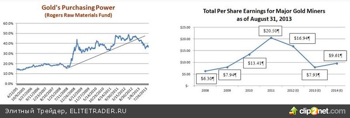 Слева: покупательная способность золота (фонд сырьевых товаров (Джима) Роджерса), справа и ниже: суммарная прибыль на одну акцию (EPS) крупных золотодобывающих компаний на 31.08.2013