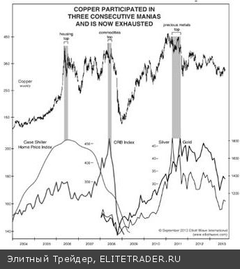 В отношении последнего графика есть ещё один интересный комментарий в выпуске The Elliott Wave Theorist от 12.09.2013 - о том, как проявляется завершение инфляционного цикла с точки зрения меди: