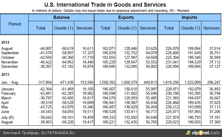 Бюро экономического анализа в отчете о торговом балансе за август, сообщило о росте дефицита, но это с пересмотренных $38,6 млрд. до $38,8 млрд. Консенсус прогноз предполагал его увеличение до $39,5 млрд. Подобный результат сложился как за счет небольшого снижения стоимости экспорта, так и за счет роста стоимости импорта, и в целом изменения незначительны.