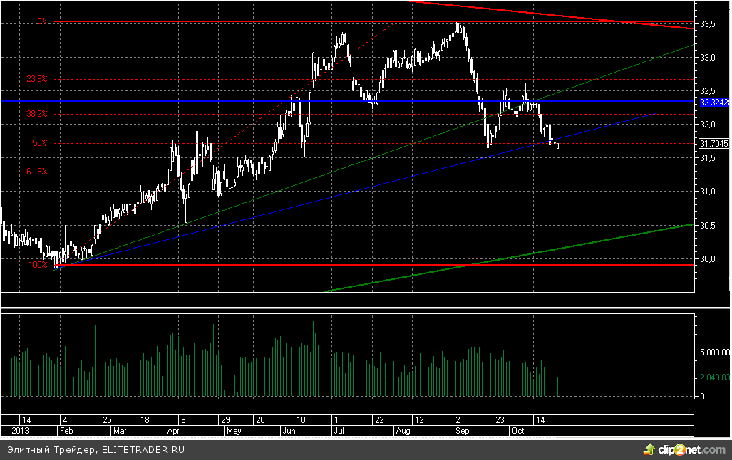 Рубль прибавляет к доллару 3 копейки. При этом российская валюта, вот уже который день консолидируется вблизи отметки 31,7. Здесь располагается 50% коррекции по Фибоначчи к волне роста по данной паре. Поэтому доллар вполне может начать укрепляться именно от данной отметки. В свою очередь покупка Банком России иностранной валюты будет лишь способствовать этому процессу. За предыдущие 2 дня российский регулятор приобрел валюты на 3,82 млрд рублей и вряд ли ограничиться этим в ближайшей перспективе. Дополнительное давление на рубль оказывает и, вероятно, будет это делать дальше низкая стоимость нефти. В частности по сорту Brent «черное золото» за уходящую неделю потеряло уже более 3% и торгуется теперь в районе 106,5 долларов за баррель.