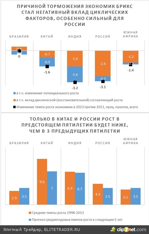 Вся боевая пятерка, еще недавно – по инерции - величавшая себя лидерами глобального роста, шагала к «застою» в ногу, хотя Россия и Индия все же заметно резвее остальных. Правда, в Бразилии, темпы в 2013 году уже не падали по сравнению с 2011, принятым за базу в качестве последнего «хорошего» для роста года, но там замедление случилось раньше, так что тамошний министр финансов, Гвидо Монтега довольно быстро свернул свою риторику о наплыве капиталов и «валютных войнах».