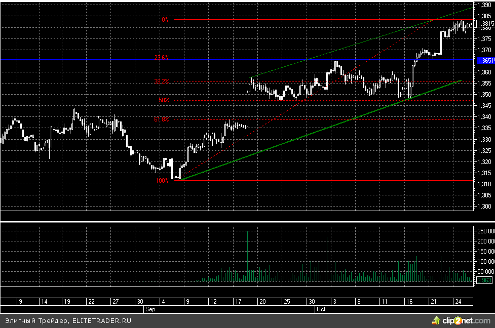 Евро прибавляет к доллару 0,1%.Европейская валюта сейчас консолидируется около своего значимого сопротивления на отметке 1,38. Именно здесь волна роста, начавшаяся 6 сентября, сравнялась по размеру с предыдущей волной роста. Поэтому пробить данный уровень без дополнительных драйверов будет крайне сложно и, скорее всего, в скором времени мы увидим снижение евро в район 1,365. Дополнительным фактором предстоящего снижения является постепенно ухудшающаяся ситуация в экономике еврозоны. В частности индекс деловой активности в производственном секторе региона за октябрь показал лишь незначительное улучшение, добравшись до отметки 51,3, а деловая активность в сфере услуг за аналогичный период упала в район 50,9 с 52,2 в сентябре.