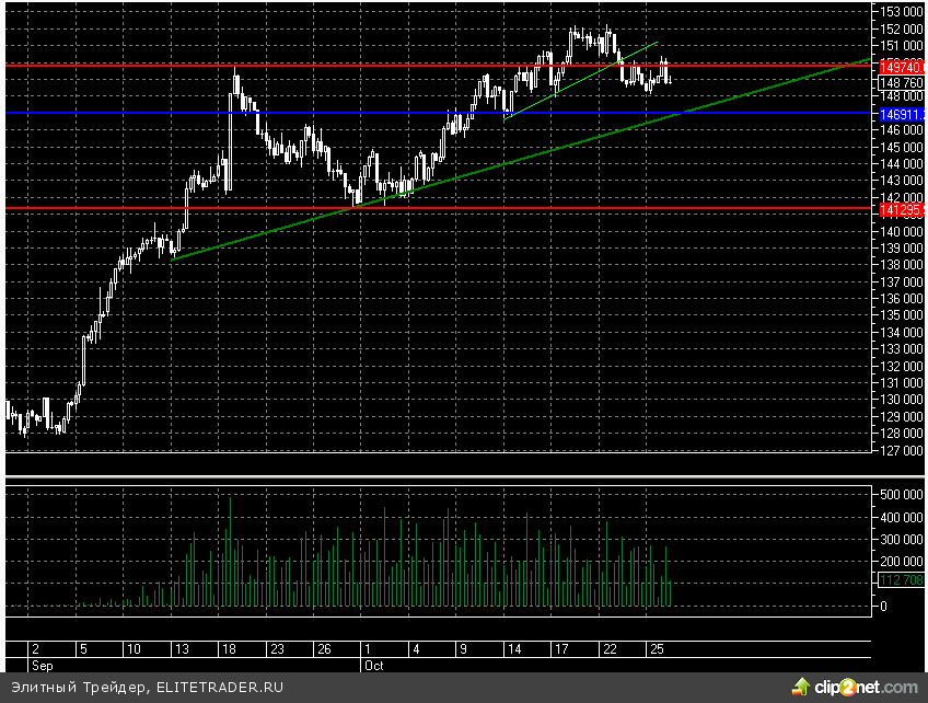 Фьючерс на индекс РТС сегодня практически не изменяется и торгуется около уровней закрытия пятницы. Данная динамика связана с неопределенностью в отношении предстоящего заседания ФРС, которое начнется уже завтра. Между тем еще утром RIZ3 уходил выше 150000, но к текущему моменту вернулся к 149000 и может продолжить снижаться в ближайшем будущем.