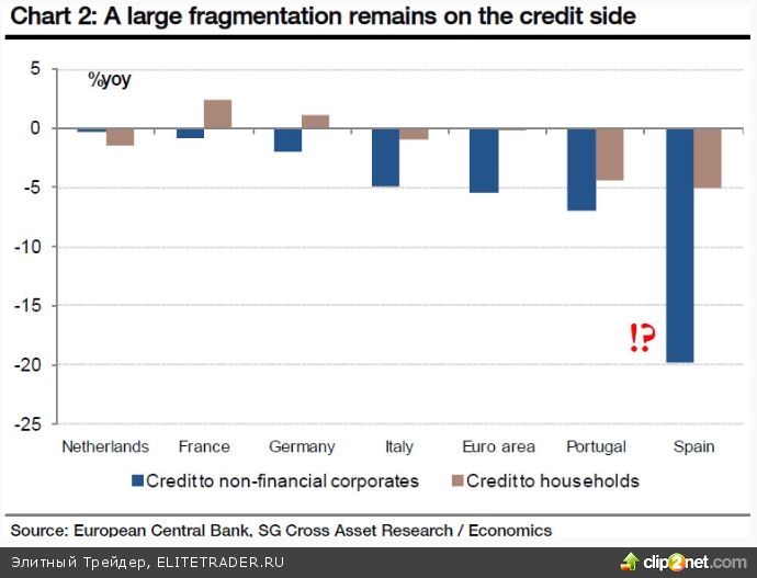 Не лучше обстоят дела и на кредитном рынке. Динамика объема кредитов, которые выдаются компаниям и домохозяйствам Испании за последний год, была самой худшей среди всех стран еврозоны. Zerohedge.com