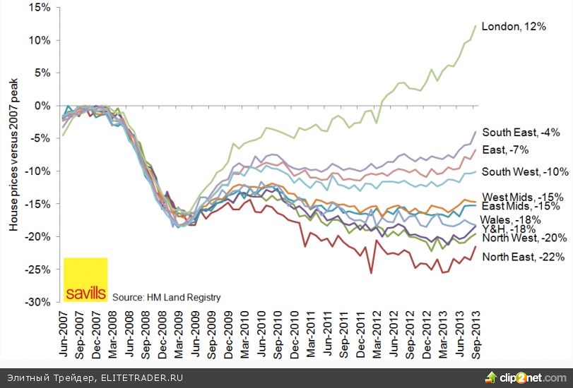 В Лондоне надувается «пузырь» недвижимости. Интересный график демонстрирует Нил Хадсон из Savills - на нем изображена динамика цен на жилье в разных регионах Великобритании, при этом за точку отсчета был взят 2007 год, когда на британском рынке недвижимости был бум.