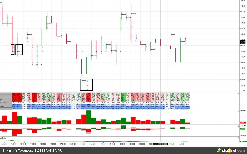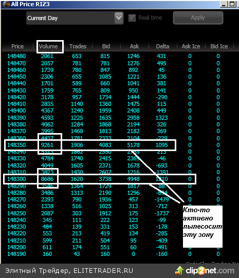 Основной объем лег в районе 149 500 пунктов. Там активно сдерживали рост лимитками. Пока склоняюсь к тому, что это лонговые объемы. Идет набор позиции в диапазоне, к этим импульсам «налипают» объемы интрадеев.