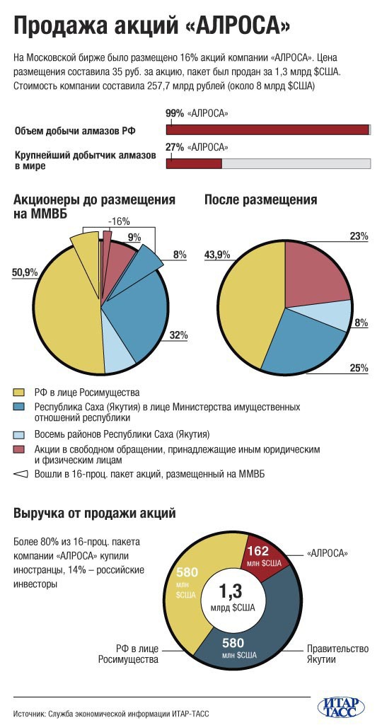 Россия и Якутия продали инвесторам во время IPO по 7% акций компании «АЛРОСА». Еще 2% продала сама алмазодобывающая компания в лице кипрского офшора Wargan Holdings Limited. Всего было продано 1,181 миллиарда акций «АЛРОСА». Продажа акций стартовала на Московской бирже 14 октября и закончилась вечером 25 октября. В так называемую книгу заявок поступили предложения от 71 компании.