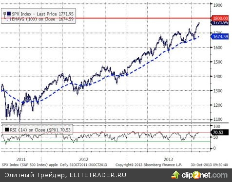 Бычий настрой не сломить. До предновогоднего ралли еще есть время, но отчетность компании, которая зачастую превосходит ожидания аналитиков, побуждает участников принимать решения о покупке уже сейчас. Рынком вероятность сокращения стимулирующей программы монетарными властями США не рассматривается реалистичной, во всяком случае, не на сегодняшнем заседании. Последствия «shutdown» еще скажутся на темпах роста экономики США, как следствие, поводов у властей растраивать рынок сейчас, в преддверии праздников, не много. По-прежнему, наша цель 1800 пунктов по индексу.