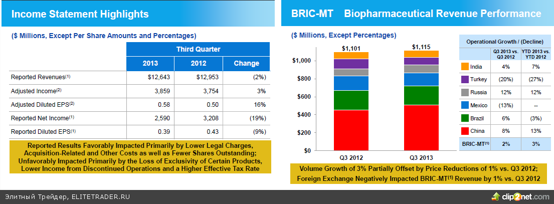 Некоторый вклад в рост индекса голубых фишек Dow Jones вчера сделали акции фармацевтического гиганта Pfizer, подорожавшие на 1,7% на фоне сильных данных за третий квартал чему способствовало сокращение расходов и рост продаж препаратов от рака. Прибыль составила $2,59 млрд , или 39 центов на акцию по сравнению с $3,21 млрд., или 43 центами на акцию годом ранее. Скорректированная прибыль составила 58 центов на акцию, превысив прогнозные 56 центов. Прогноз до конца года по прибыли был повышен в части нижней границы обозначаемого ранее диапазона с $2,1-2,2 до $2,15-2,2 на акцию.